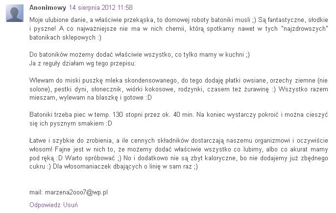 Przepis na batoniki wykorzystam z pewnoscia w ciagu kilku dni – dziekuje i gratuluje! Mam pytanie – w zwiazku z tym,ze w temat sie dopiero wkrecam i dzieki temu blogowi przejrzałam na oczy i polowa kosmetykow jest juz w koszu, prosze o informacje czy moge zuzyc do konca ta maske -> http://wizaz.pl/kosmetyki/produkt.php?produkt=32847 czy zdecydowanie lepiej zakupic 'zdrowsza'. Moje wlosy reaguja na nia bardzo pozytywnie, mam jeszcze ponad polowe,ale jestem slonna ja wymienic na 'lepszy model' 🙂 Prosze o odp. Pozdrawiam. Karolaina