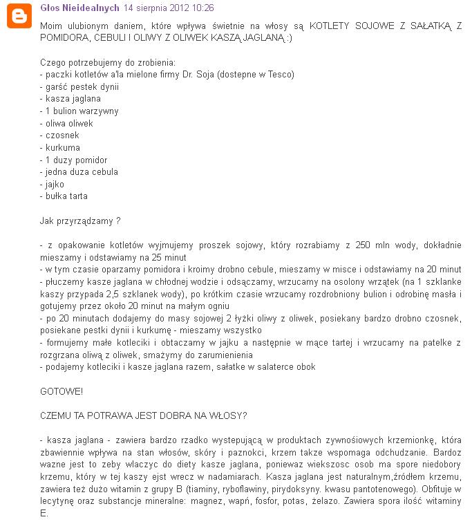 poza tym w tamtym wpisie jak byk pisze: ulubione danie, które ma również dobry wpływ na włosy. Kotlety sojowe, które w składzie mają jajko w proszku i inną chemię też dobrze wpływają na włosy? Nie sądzę. Masz dużą wiedzę na temat włosów, ale każdy ma swoje zdanie. Ja swojego nie zmienię.Tak więc nie czuj się obrażona, bo to tylko moja opinia. Ale trudno 😉 Twój konkurs, twoja sprawa i twój wybór. Nie brałam w nim udziału, bo i tak bym nie wygrała więc co ja będę się udzielać w tej kwestii.. ;D