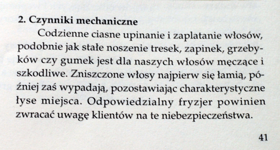 Autorzy chyba nie słyszeli jeszcze wtedy o PPD i o jego wpływie na wypadanie włosów 😉 W dzisiejszych czasach wiemy już, że właśnie farbowanie (zwłaszcza na ciemne kolory) jest jedną z częstszych przyczyn tego problemu. Natomiast w przypadku rozjaśniania czy trwałej ondulacji częściej będziemy mieć do czynienia z łamaniem włosów niż z ich wypadaniem.