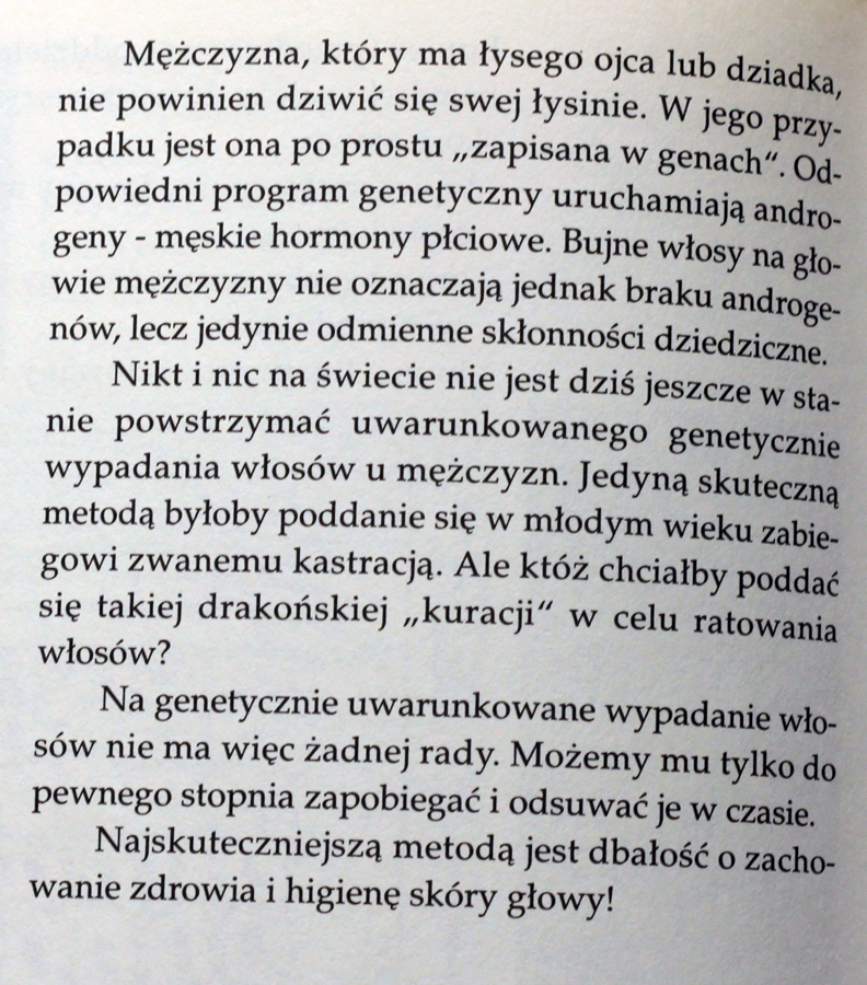 W dzisiejszych czasach wiemy już, że łupież jest chorobą skóry głowy (autorzy w książce twierdzą jeszcze, że to jedynie “problem natury kosmetycznej”) i można go skutecznie leczyć. Najlepiej jest w tym wypadku wybrać się do dermatologa by przepisał nam skuteczny lek lub szampon. Co nieco o łupieżu pisałam już na blogu TUTAJ.