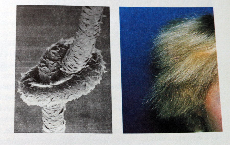 | Uszkodzony włos widziany pod mikroskopem i na głowie (takie włosy jak na 2 zdjęciu miałam okazję widzieć wczoraj na żywo – tylko były znacznie dłuższe i brązowe). |