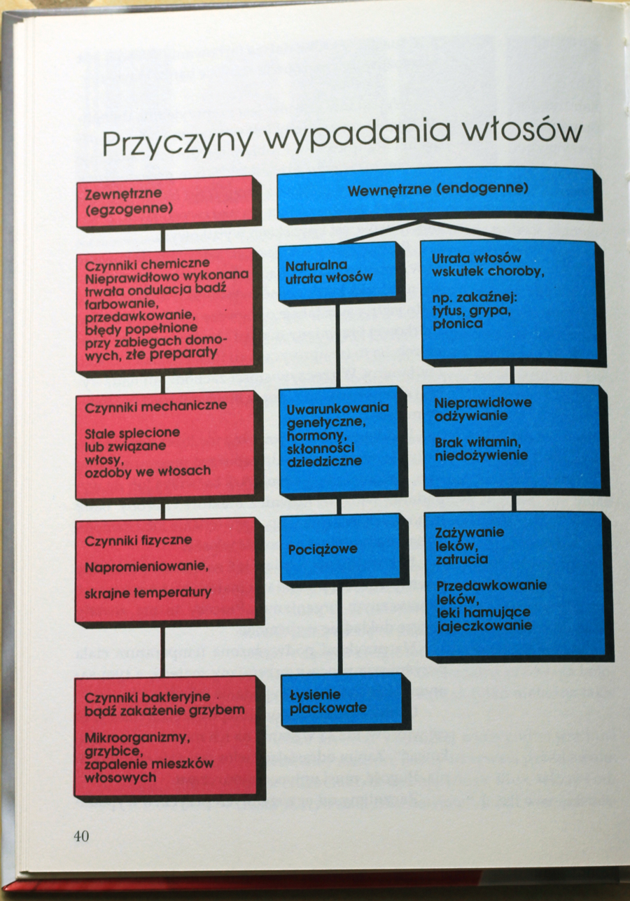 Zastanawiałam się nad tym, czy nasza wiedza na temat przyczyn wypadania włosów jakoś znacząco zmieniła się od czasów opublikowanie tej książki (przypominam był to 1987 rok) i wydaje mi się, że raczej nie. Spodobał mi się za to wykres, który zobaczycie poniżej, bo jest to w nim ładnie uporządkowane.
