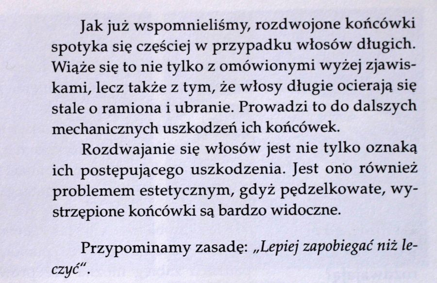 Pomiędzy pakowaniem walizki, a biegiem na pociąg udało mi się wybrać dla Was kolejny fragment książki “Wszystko o włosach” :)) Tym razem znów powracam do tematu rozdwajających się włosów. Poniżej przeczytacie o tym dlaczego właściwie włosy nam się rozdwajają i jak się je przed tym chroniło dawniej…