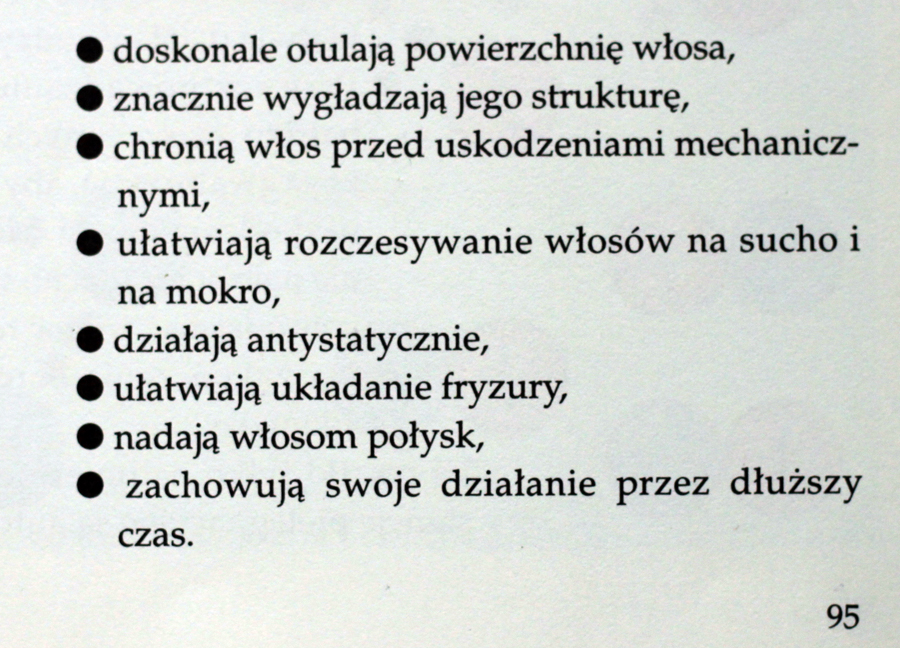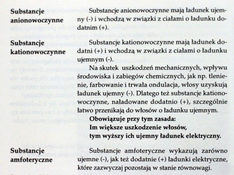 Na skanowanych stronach widzę jednak sporo rzeczy we mnie na dziś wywołujących uśmieszek i po prostu nieprawdziwych. Choćby to, że włosy skutkiem zabiegów – ogólnie rzecz ujmując – fryzjerskich mają ujemne pH… Ciekawe… Szczególnie, że większośc zabiegów fryzjerskich ma na celu podwyższenie pH (bez tego nic się nie zadzieje), a kwaśne płunkani – zakwaszenie, czyli powrót do naturalnego środowiska. Skóra ma kwaśny odczyn, włosy również, nawet niższy od skóry.
