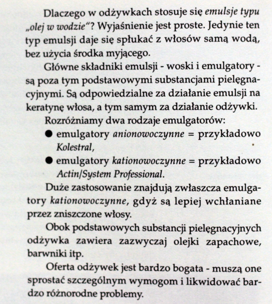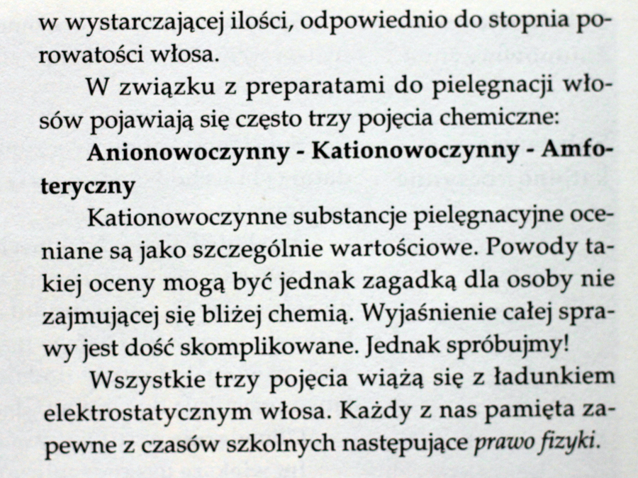 Chciałabym Wam przy okazji napisać co nieco na temat substancji kationowoczynnych. Jak zauważyli autorzy książki są one rzeczywiście bardzo korzystne dla włosów. Działają kondycjonująco (czyli natychmiast poprawiają wygląd, ale nie stan włosów) oraz antystatycznie (zapobiegają elektryzowaniu się), sprawiają, że włosy są miękkie, gładkie i łatwo się rozczesują, a ubytki w łusce tymczasowo wypełnione, ale niestety są też najbardziej drażniące. Najłagodniejsze dla skóry są substancje niejonowe, potem anionowe, a najmniej właśnie kationowe. To kolejny powód by nie kłaść odżywek na skalp, a jedynie “od ucha w dół”. Teraz też rozumiem skąd może się brać wzmożone wypadanie włosów u niektórych osób myjących głowę odżywką… Dla osób z bardzo wrażliwą skórą głowy lepszym wyborem będzie metoda OMO przy czym wybierając szampon warto poszukać takiego bez kationowoczynnych emulgatorów.