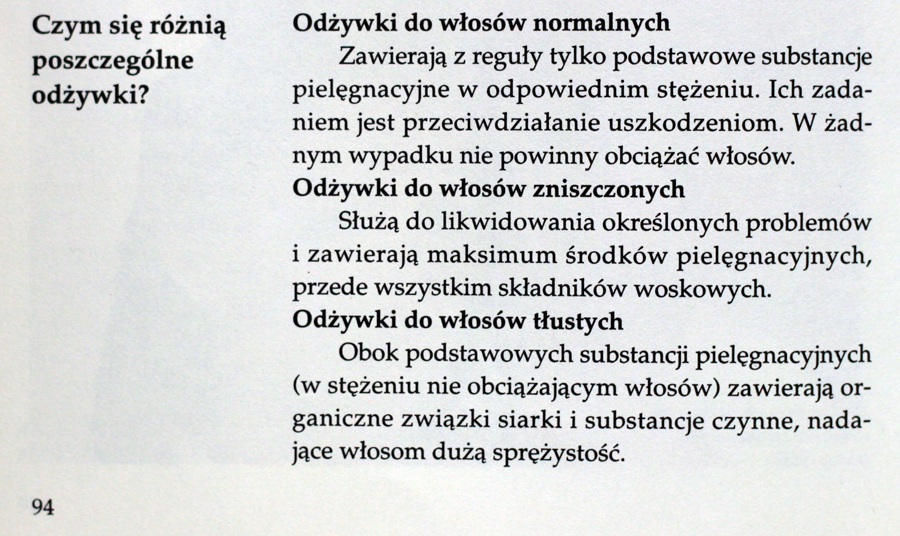 Ostatnio było sporo o szamponach i myciu włosów dziś dowiecie się co nieco na temat odżywek. Bardzo się cieszę, że sięgnęłam po tę książkę, bo dzięki niej, a dokładniej dzięki dzisiejszemu fragmentowi dowiedziałam się czegoś zupełnie nowego.