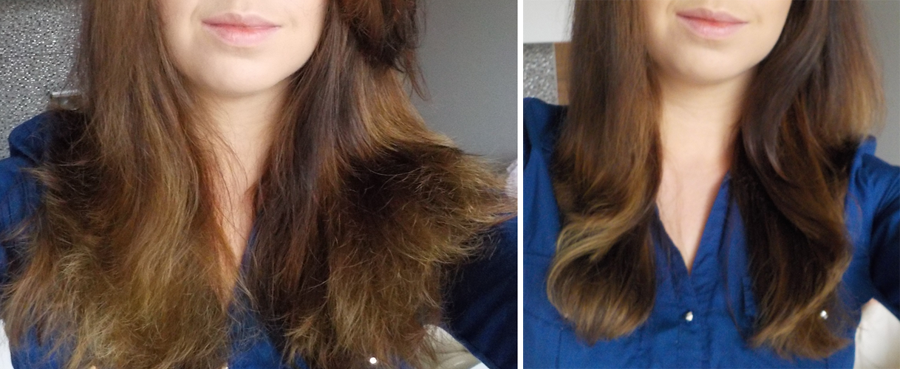 Wczoraj nałożyłam na długość oliwę z oliwek, zmyłam ją dopiero dziś w południe szamponem ze SlS, a później jeszcze trzymałam przez pół godzinki odżywkę (Garnier – Avocado & Karite). Pielęgnacje zakończyłam oczywiście wyżej opisanym sposobem.